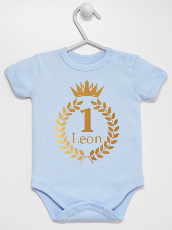 Urocze ubranko dla niemowląt z napisem „Jedynka z Imieniem Leon Nadruk Złoty”.