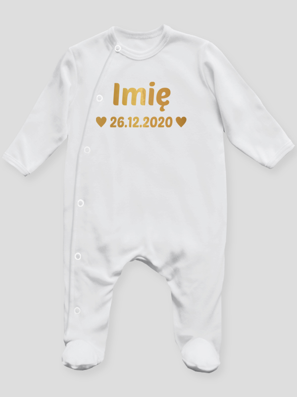 Nasz oryginalny śpioszek ze złotym nadrukiem imienia i daty urodzenia z serduszkami to wyjątkowy prezent dla maluszka oraz wspaniała pamiątka dla rodziców. Dzięki temu nadrukowi, każdy pajacyk staje się niepowtarzalnym upominkiem.