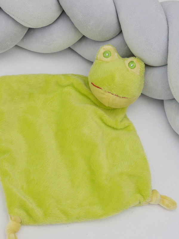Żabka została zaprojektowana jako przytulanka sensoryczna – posiada węzełki i zróżnicowane faktury, które: