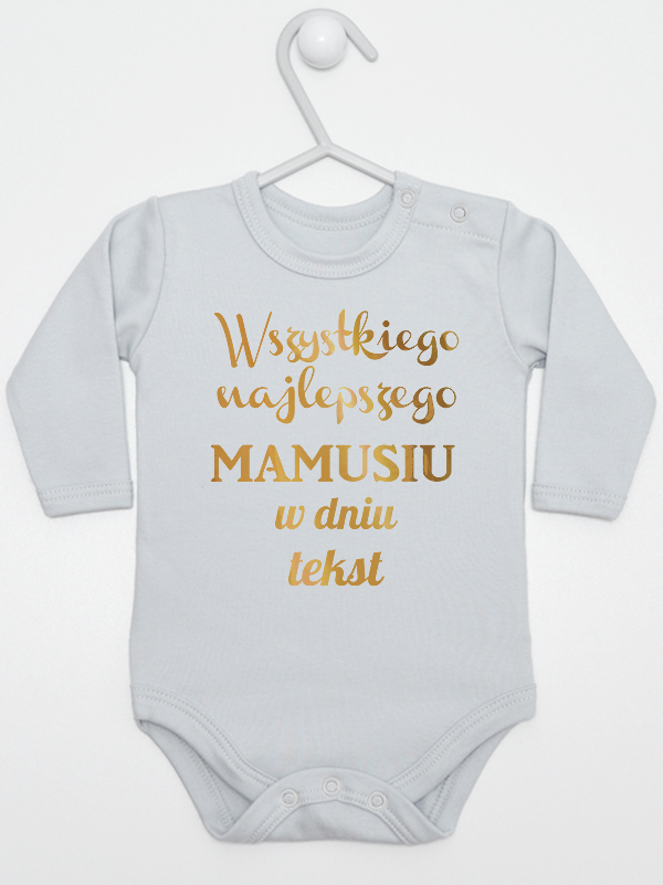 Eleganckie body ze złotym nadrukiem Wszystkiego najlepszego Mamusiu w dniu (wybierz tekst). Wygodny bodziak dla niemowlaka, dostępny w bogatej gamie kolorów oraz z rękawami krótkimi lub długimi.